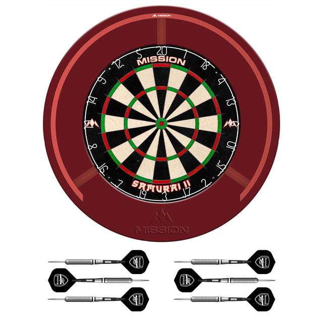 Mission Samurai II x Arsenal Dartboard-Set – Dartscheibe, Surround, Torus 270 Light und 2 Sets Messingpfeile – Rot ist nachbestellt und wird versandt, sobald es wieder auf Lager ist.